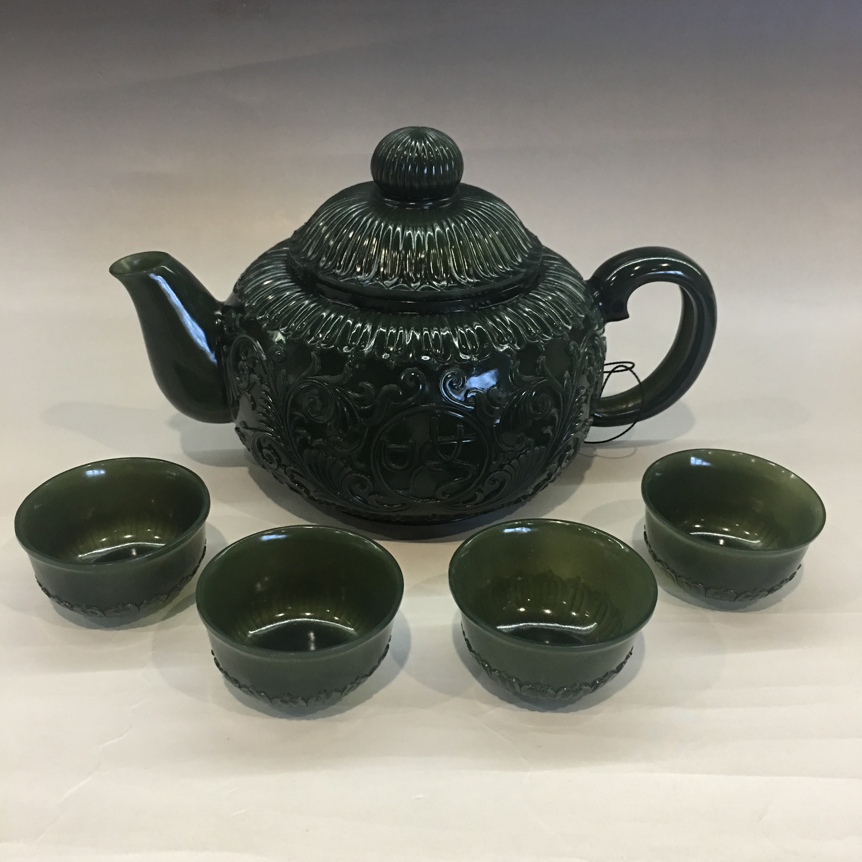 整器型制规整,壶嘴流畅出水,杯腹圆融聚香。置茶席间,玉色衬茶烟,既为品茗佳器(聚香锁味,触手生温),亦是文房雅藏(玉质传家,纹样载福)。