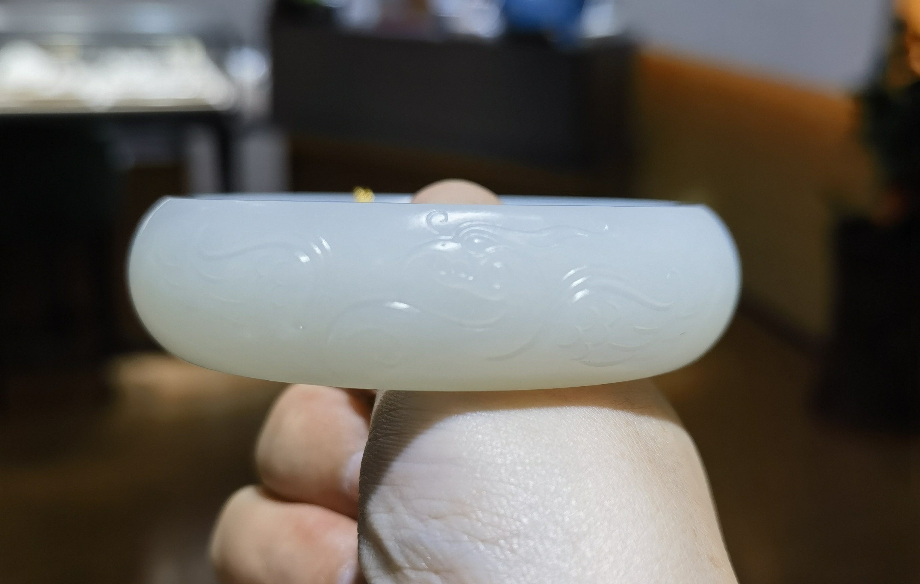甄选和田籽料,玉质凝脂温润,白如凝脂,手镯外壁浮雕凤纹:凤首昂扬,羽翅层叠舒展,尾羽如流云曳地,线条婉转流畅,凤仪灵动,似欲振翅而飞。