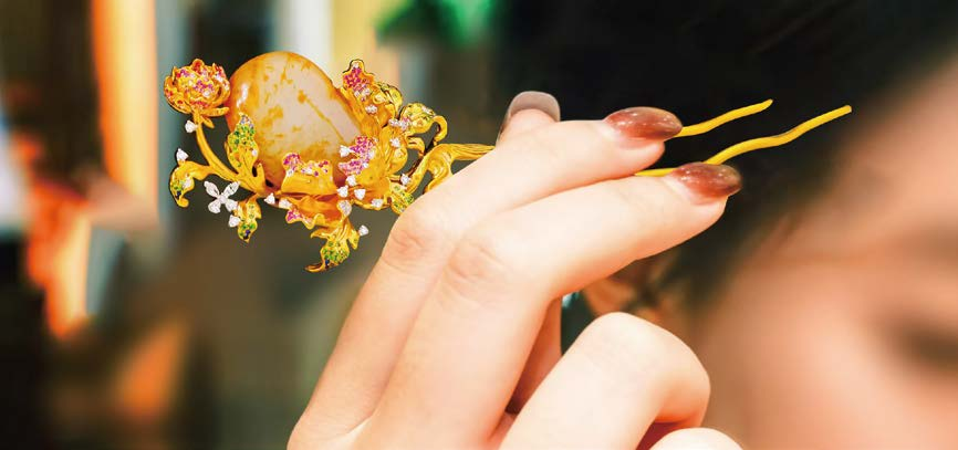 文化寓意:发簪承续“金枝玉叶”的古典意象,象征身份尊贵、气质典雅;籽料稀缺性结合金镶工艺,既是实用发饰,更是可传世的珠宝臻品,寓意“云鬓花颜,福运随身”。