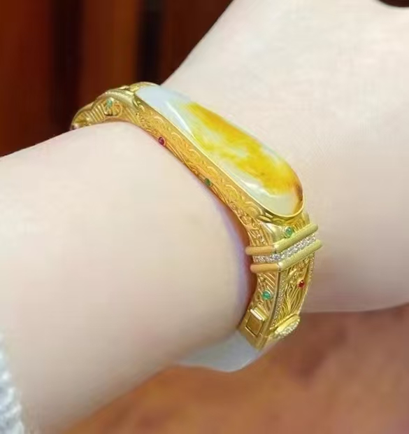 场景适配:出席宴会,与礼服相衬尽显东方贵气;日常佩戴,为简约穿搭添一抹奢华亮点。自留赏玩(藏纳金玉之珍,品味籽料与金工的双重匠心),或馈赠名流(传递“金玉良缘,尊荣共享”的心意),皆能让这只手镯成为腕间传世之作,流转间尽展奢华与雅韵。