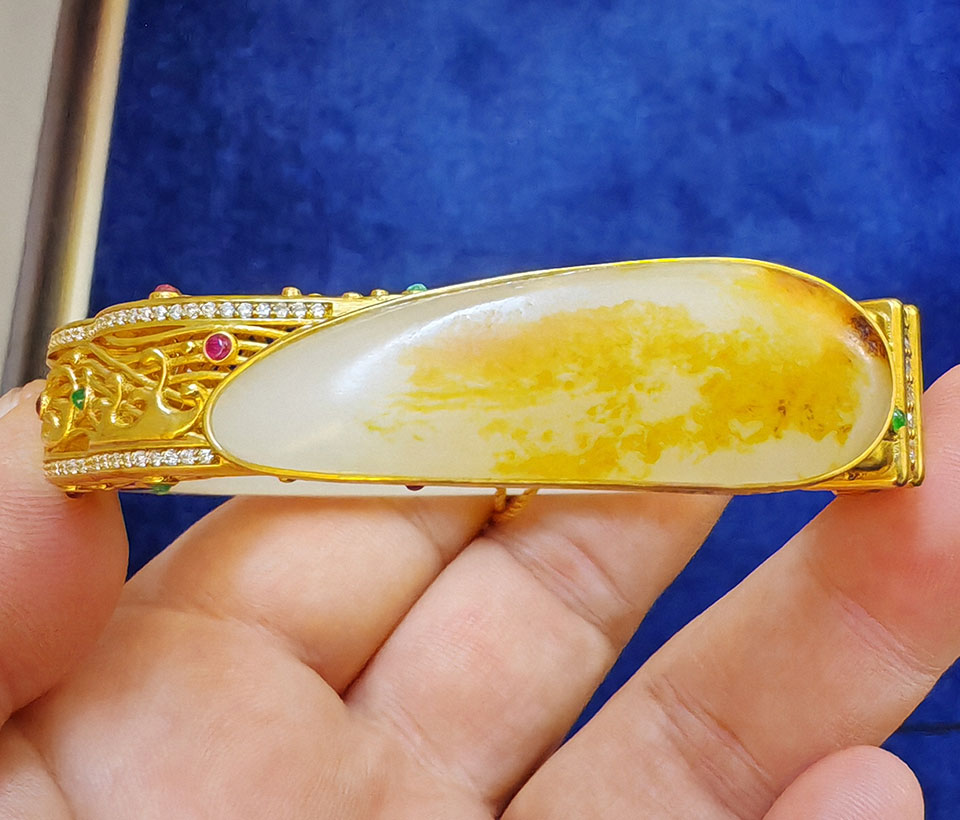 工艺细节:手镯打磨细腻,宝石镶嵌牢固,玉与金的衔接处严丝合缝,既保证佩戴舒适度,又让玉的温润与金的璀璨相得益彰。