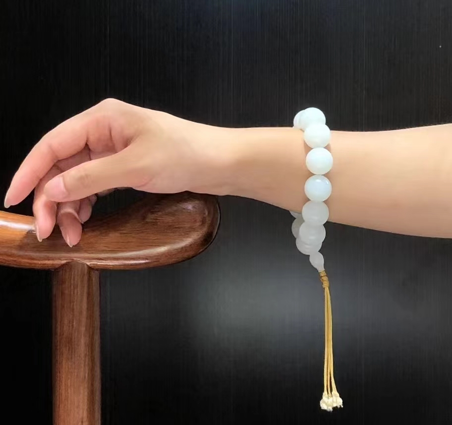 文化寓意:籽料象征自然本真,圆珠寓意“圆满顺遂”,佩戴于腕,承玉文化温润之德,展东方美学的含蓄与大气,日常搭配衬出素雅气质,雅集佩戴更显格调,是玉友珍藏、礼赠佳人的臻品,腕间一抹脂白,岁岁安暖,步步生韵。